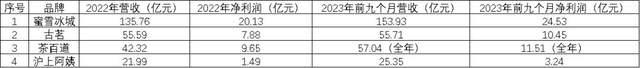 茶百道排在第三,2022年-2023年,分别实现营收42.32亿元、57.04亿元;应占年内利润及全面收益总额分别为9.65亿元、11.51亿元。