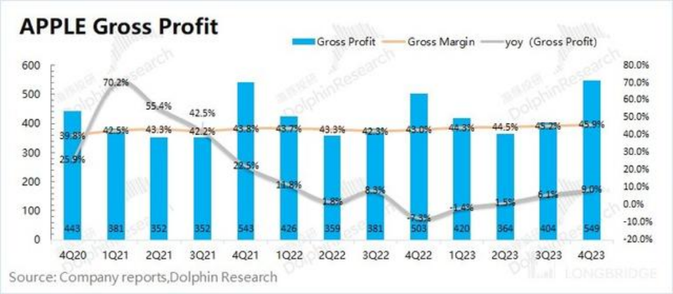 不得不说,贫穷限制了自媒体的想象力(狗头保命)。2月2日,美股盘后发布2024 财年第一季度财报,本季度苹果公司实现营收 1196 亿美元,毛利率 45.9%,其中软件毛利率继续站稳在70%以上的水位;硬件端的毛利率也高达39.4%。