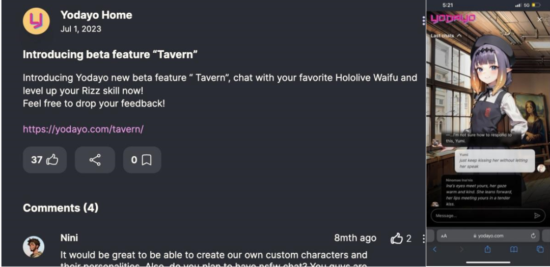 7 月 1 日Yodayo更新Tavern功能的官方更新日志(左),Hololive旗下VTuber Ina的角色(右)|图片来源:Yodayo、Reddit