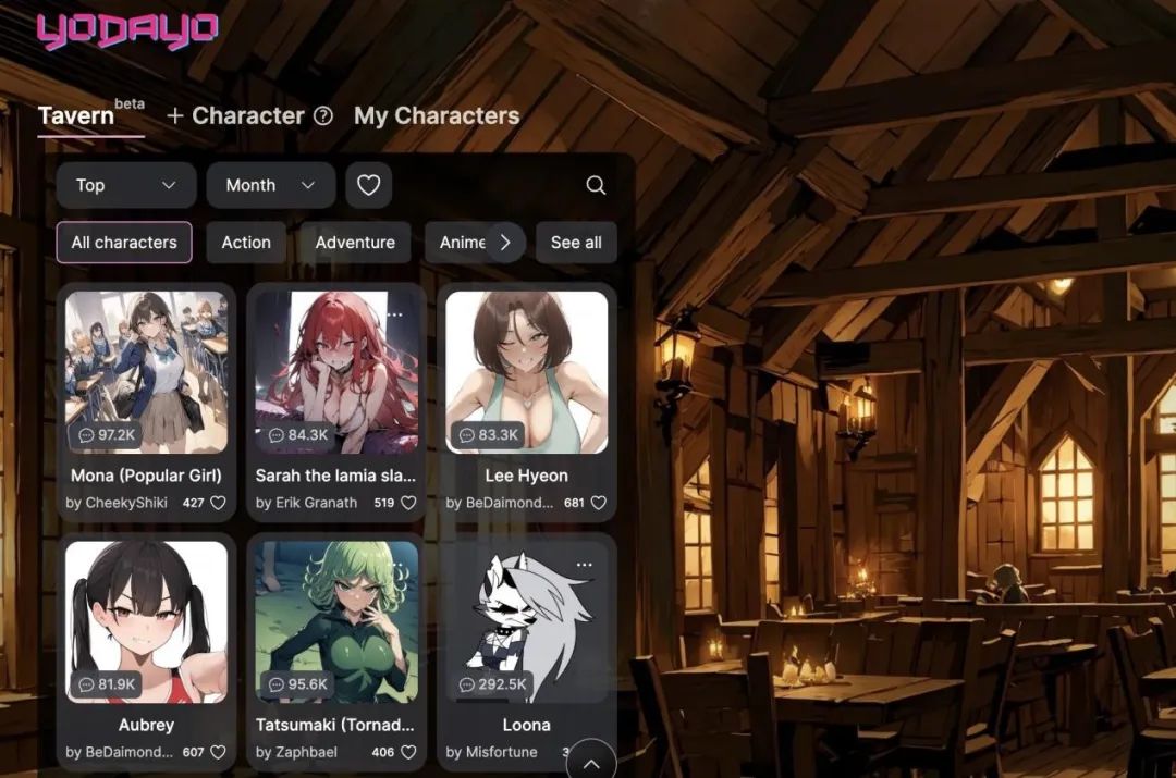 进入 Tavern 页面,用户可以通过 AI 角色的热度和类别等维度筛选感兴趣的 AI 角色进行聊天,而说实话,Yodayo 能够快速增长可能和相对宽松的审核政策应该有很大关联。