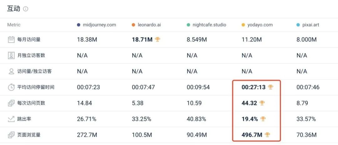 笔者对比了 AI 生图产品网站流量 Top5 的数据后发现,虽然在每月访问量上 Yodayo 只排在第三,但是在平均访问时间、访问页面数、跳出率和各页面总浏览量等数据上,Yodayo 均遥遥领先。![]()