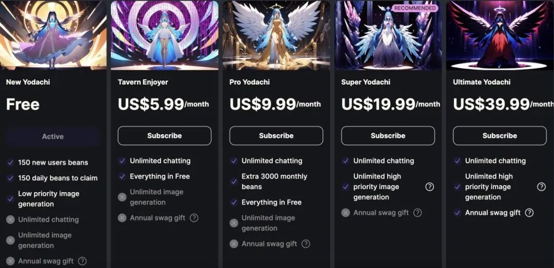 而每当用户与角色进行聊天时,制作这个角色的创作者可以获得 10% 的收益,以 YoBeans 的形式发放到账户中(相当于每 10 条聊天 1 个 YoBeans),但是 YoBeans 不能提现,只能在聊天和生图中使用。从 Yodayo 现在的订阅方案来看,聊天是被作为更基础服务出售的,而无限次数优先生成图片甚至被作为最高两档订阅才能解锁的功能,赚钱的重任交给了谁,也是更刚需的服务。