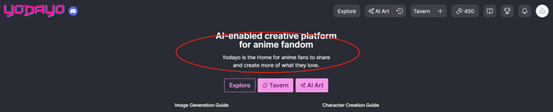 网站定位在日本动漫粉丝的 AI 创意平台,主页的功能按钮有三个,Explore(社区)、Tavern(AI 角色聊天)、AI Art(生图),而且主页的视频教程也有两个,一是“生图教程”,二是“ChatBot 创建教程”。一个兼具角色聊天的生图网站(或者也能反过来说),Yodayo 访问时长的表象,基本上能找到根源了。而将生图和聊天两个场景做在一个产品里面,Yodayo 到底是怎么想的呢?而 Yodayo 的流量又是哪里来的呢?