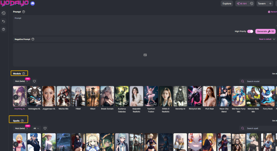 这些模型,其实是各种创作者基于开源模型 Stable Diffusion 去训练的 Checkpoint 和 Lora 模型。用户输入 prompt 和 negative prompt 之后,可以通过选择模型(checkpoint)和 spells(Lora)来控制图片生成的风格和细节。这可能是 Yodayo 与一般的图片生成网站的区别,但和同样的二次元生图产品 PIXAI,其实大差不差。而且 PIXAI 直接在网站中就内置了一个制作 Lora 的工具,用户付费后可以直接制作和使用。