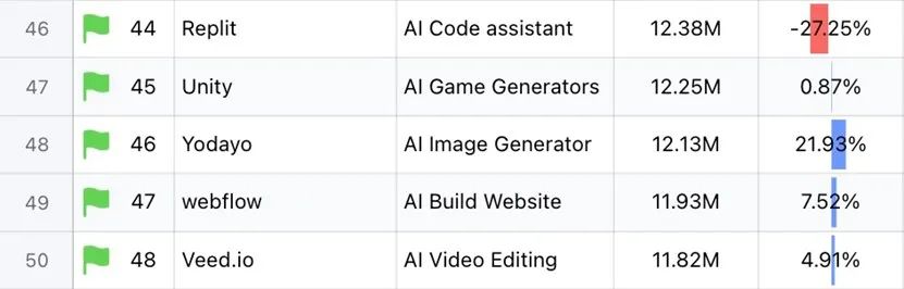 Yodayo 在全球 AI 产品流量 Top100 中的位置(全品类)|图片来源:aicpb.com