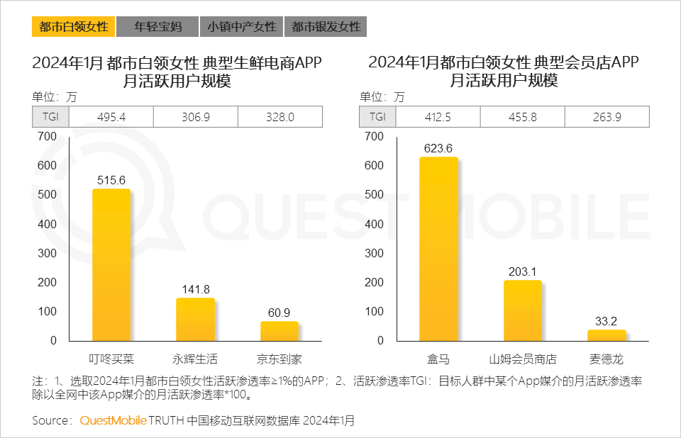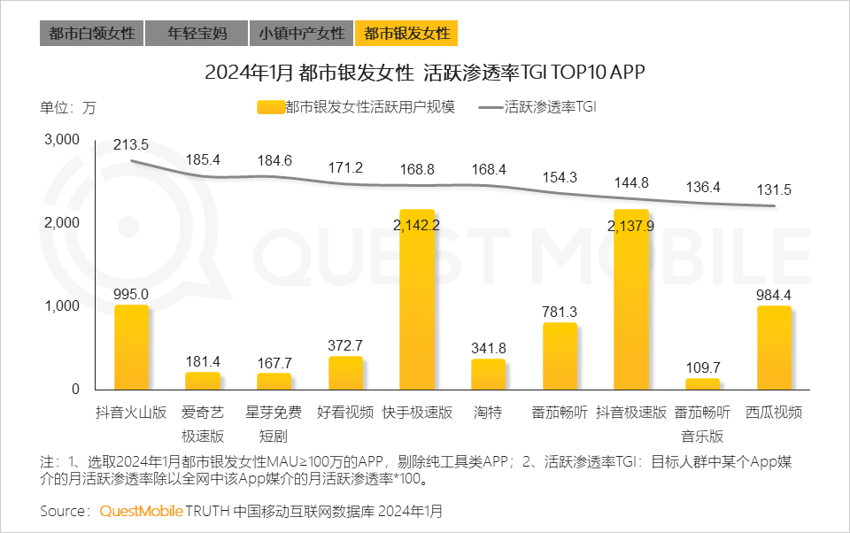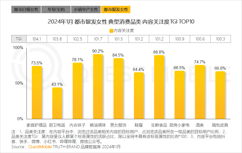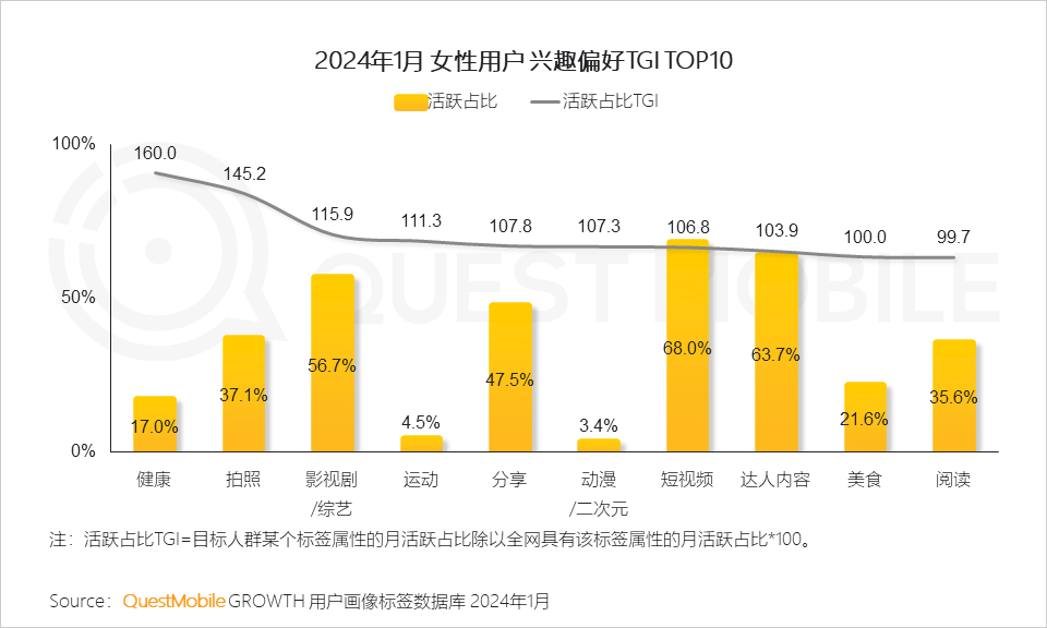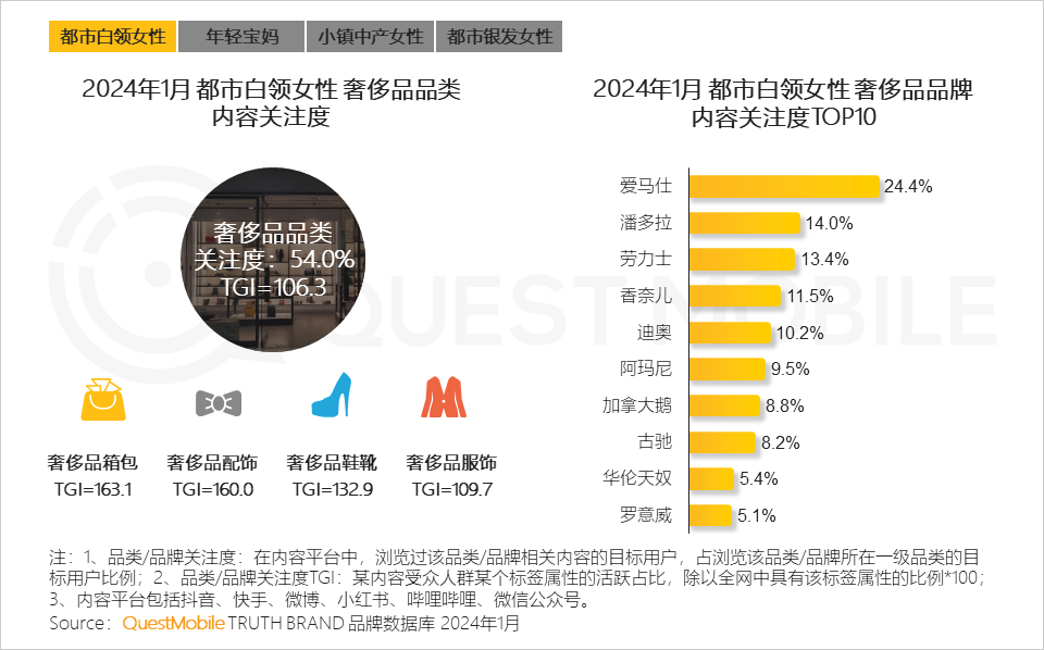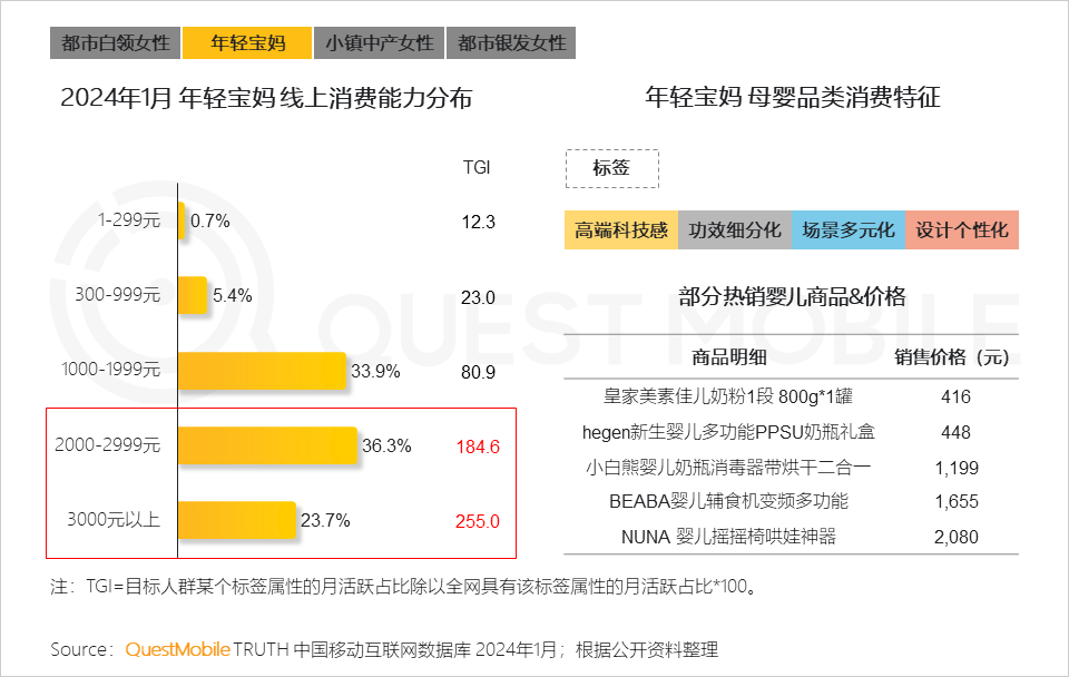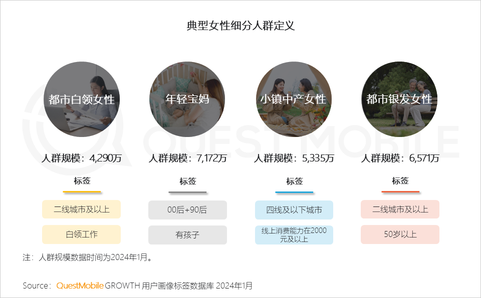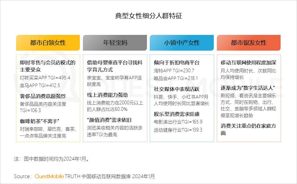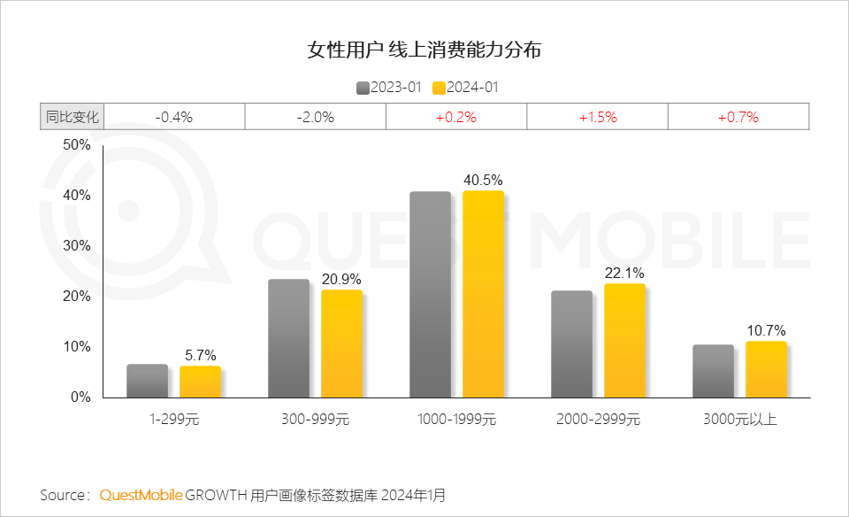 QuestMobile数据显示,2024年1月,线上消费能力在2,000元以上的女性用户占比达32.8%,同比增长2.2%。