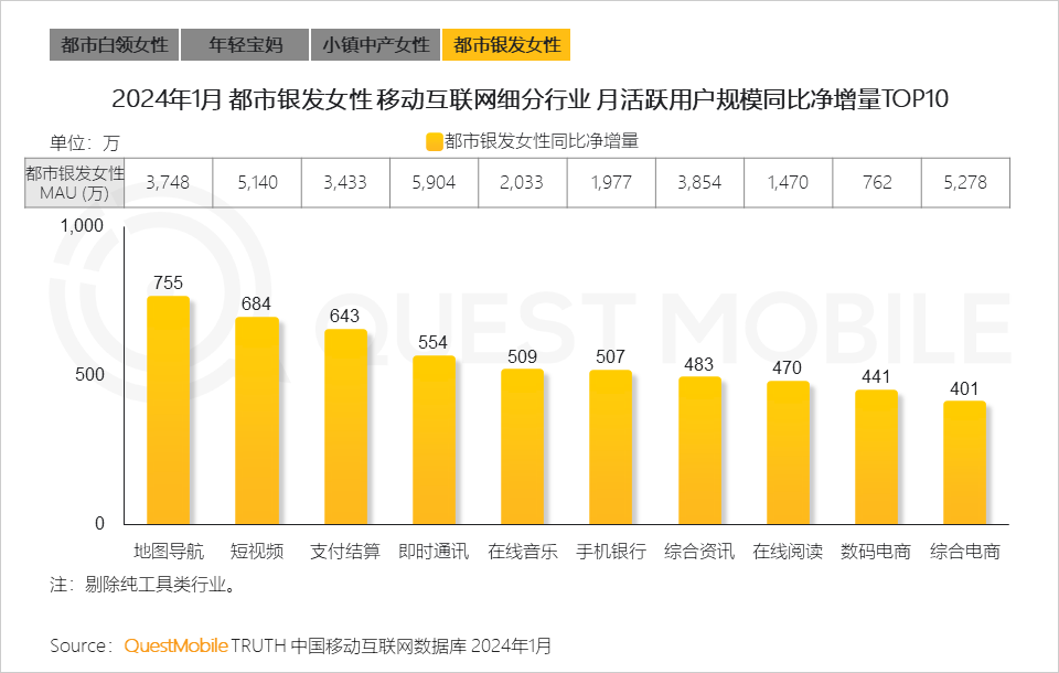 5.2 都市银发女性人群逐渐养成线上使用习惯,出行、娱乐、购物、社交等APP用户规模显著增长