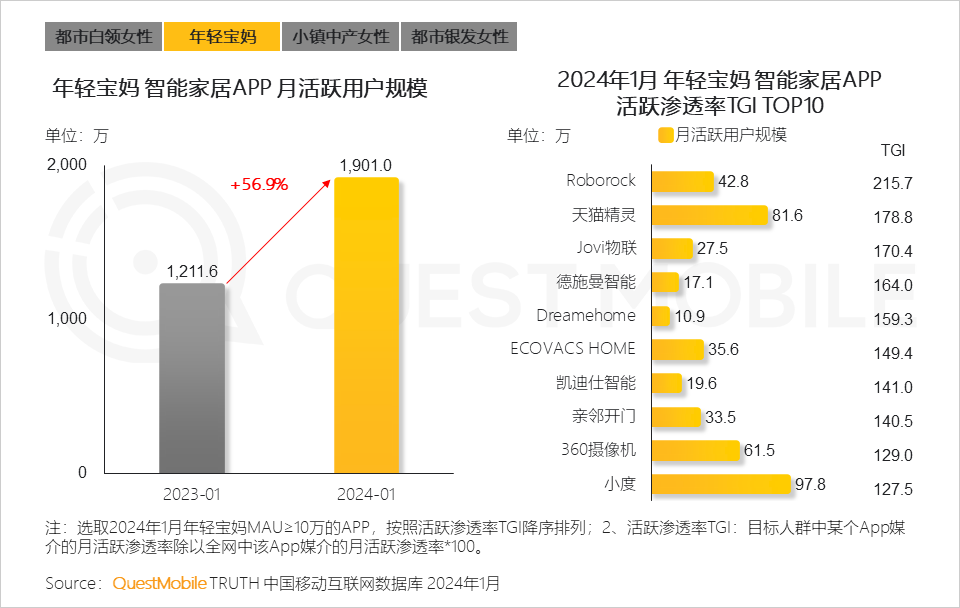 受女性用户结构变化带来的影响,女性群体的细分更加清晰,都市白领、年轻宝妈、小镇中产、都市银发女性等用户规模分别达到4290万、7172万、5335万、6571万,不同群体的消费偏好差异较大,例如,年轻宝妈往往“精致育儿”和“颜值消费”两不误,且倾向于借助智能家居产品提高家务效率、提升生活品质。