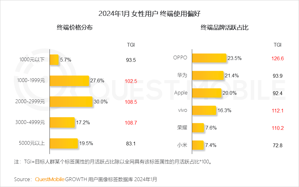 实际上,总体上看,女性群体的消费能力在持续提高,截止到2024年1月,线上消费能力在2000元以上的女性用户占比达到32.8%,同比增长了2.2%;受时尚设计、拍照体验等需求影响,在活跃终端分布上,OPPO、华为、苹果、vivo分别占比23.5%、21.4%、20%、16.3%。