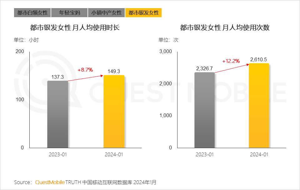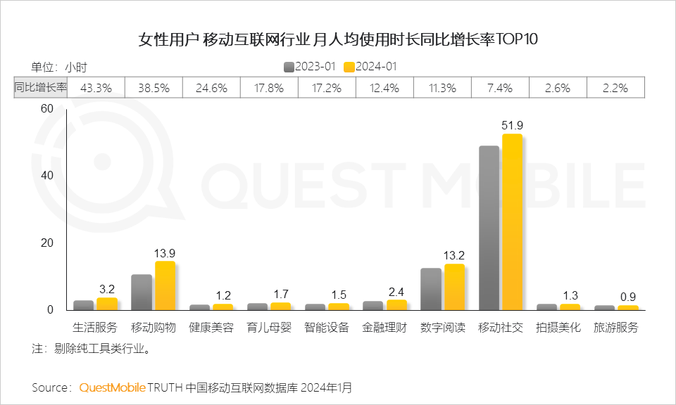 QuestMobile数据显示,2024年1月,女性用户移动购物APP月人均使用时长达13.9小时,较去年同期的10.1小时增长了38.5%。