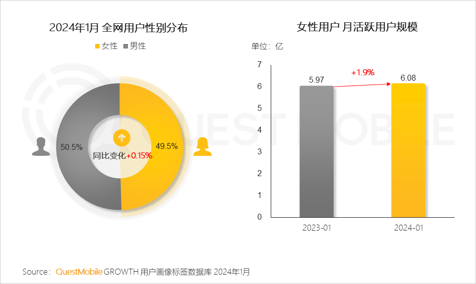 QuestMobile数据显示,过去一年来,女性群体在移动互联网中的占比持续提高至49.5%,截止到2024年1月,女性用户月活规模达6.08亿,同比增长1.9%,这其中,90后占比最高,达19.4%,二线及以上城市用户同比增长了6.6%。