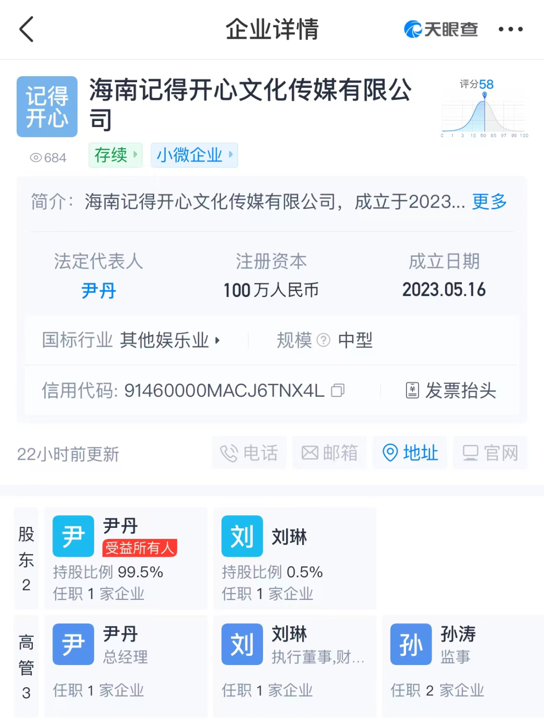 但新公司终究是要自负盈亏的。查询天眼查可以发现,“记得开心”跟椰树集团没有股权上的联系,实际控制人是尹丹丹,持股比例达到99.5%。