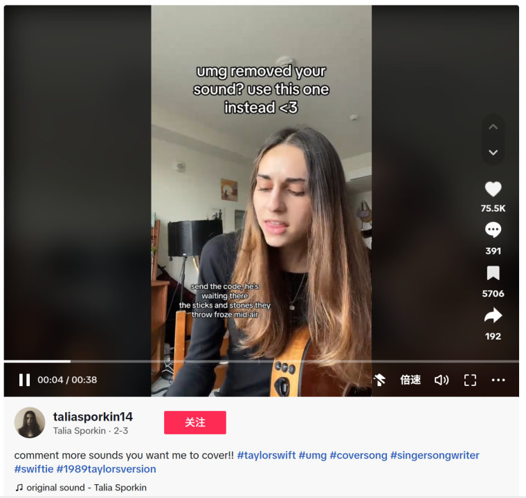 近来,TikTok的海内外版都无法在视频中添加任何来自环球音乐旗下艺人的视频背景音乐,深受TikTok好处的泰勒·斯威夫特(产生了所谓的“SwiftTok”现象)和艾米纳姆等歌手首当其冲。已经上传的相关视频将被静音。进入3月份,TikTok不得不撤下更多的歌曲,它们不一定来自UMG旗下艺人,但包含由环球音乐出版集团(UMPG)控制的内容。例如像阿黛尔这样的歌手的几首名曲。