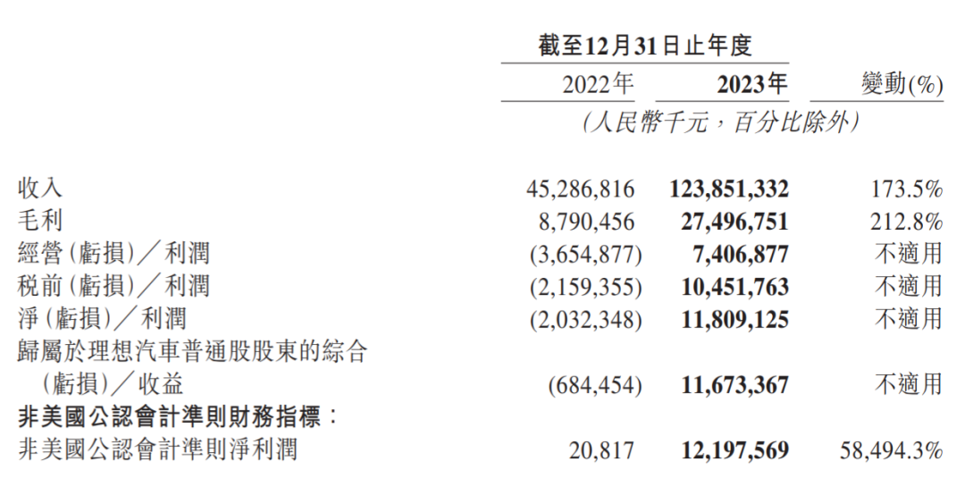 财报显示,理想汽车2023年全年营收为1238.5亿元(174.4亿美元),较2022年的452.9亿元增加173.5%。净利润118.1亿元,2022年同期净亏损20.3亿元;全年交付量376030辆,同比增长182.2%。