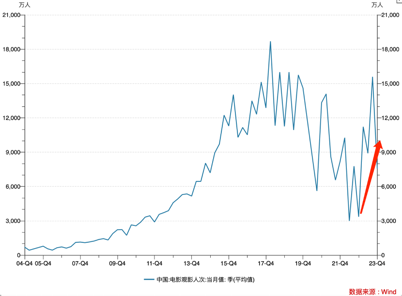 进入2023年,无论是供给端(立项和电影产出)到需求端(电影观影人次,见下图),均出现了明显反弹。