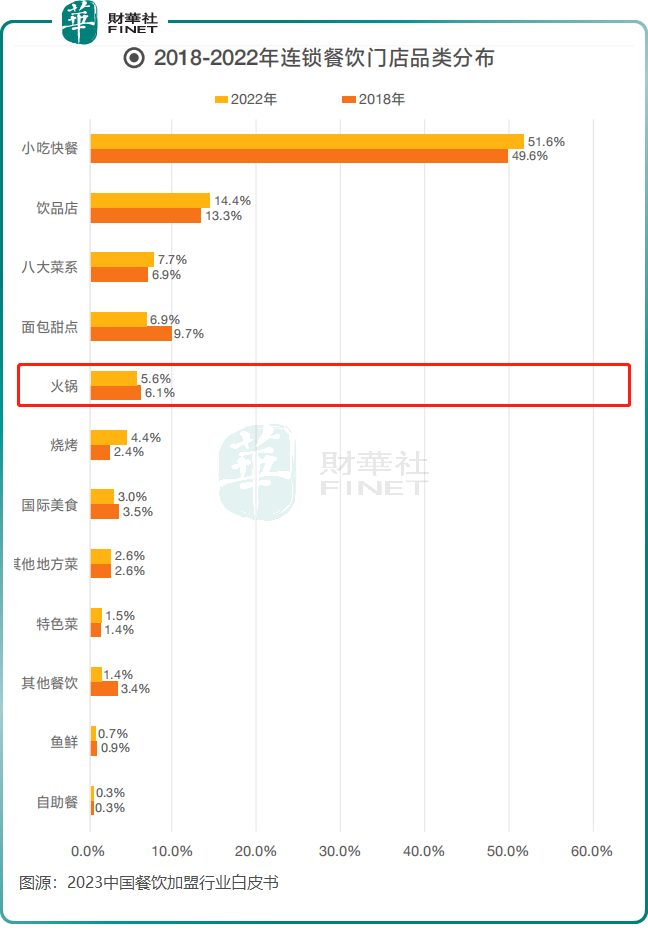 对于小吃快餐、饮品、菜系和面包甜点领域来说,我国火锅领域的连锁化较低,2022年仅为5.6%,与整个餐饮业19%的连锁化率仍有较大差距。