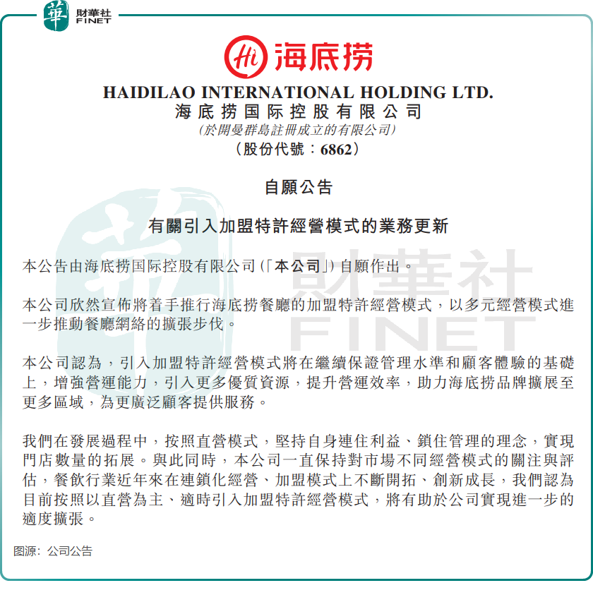 海底捞在公告中表示,将着手推行海底捞餐厅的加盟特许经营模式,以多元经营模式进一步推动餐厅网络的扩张步伐。