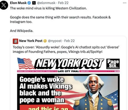 近几年美国原本就对于“觉醒文化(Woke)”争议颇多,Gemini登时被指责“反白人”。马斯克也在自家社交媒体上转发相关帖子,并直言:“病毒式的觉醒思维正在摧毁西方文明。”