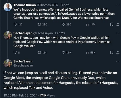 一位网友讽刺道:托马斯您好!我可以用谷歌钱包(Google Wallet)里的谷歌支付(Google Pay)付钱吗?前身是安卓支付(Android Pay),在之前被称作谷歌钱包。如果不行的话,我们可以通个电话讨论一下支付事宜。我会发给你一个谷歌会议(Google Meet)链接,就是那个被称作Google Chat的,在那之前叫Duo。Duo取代了Allo,Allo取代了Hangouts。哦对了,Hangouts之前是+hangouts,取代了Talk and Voice。