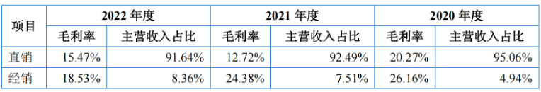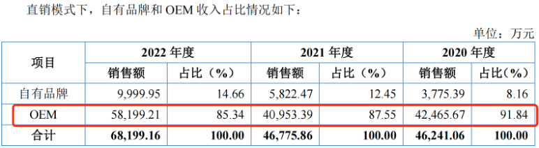 招股书显示,公司的销售模式分为直销和经销两种,其中直销模式以OEM产品为主,报告期内的营收占比分别为91.84%、87.55%和85.34%。