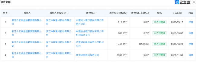企查查显示,白云伟业拥有三块产业:以化工业为主导产业、建筑房地产和宾馆旅游业。值得注意的是,白云伟业2021年,已经分四次进行股权质押,质押股份市值累计高达5.34亿元。