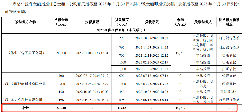 不仅如此,丰岛控股及丰岛食品实控人还向第三方提供担保,截至2023年9月30日,对外担保总金额高达2.26亿元。