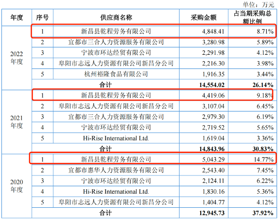 报告期内,新昌县乾程劳务有限公司(以下简称“乾程劳务”)是丰岛食品的第一大供应商,丰岛食品向其采购劳务外包服务,采购金额分别为5043.29万元、4419.06万元和4848.41万元,占当期采购总额比例分别为14.77%、9.18%和8.71%。