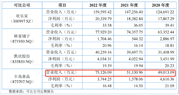 2020年-2022年(以下简称“报告期”),丰岛食品的营业收入分别为4.9亿元、5.11亿元和7.51亿元,同期净利润分别为4610.36万元、1578.06万元和3744.25万元。