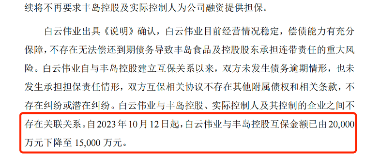 虽然丰岛食品在问询函回复中表示,目前白云伟业的经营情况稳定,偿债能力有充分保障,且双方互保金额从2亿元下降至1.5亿元。