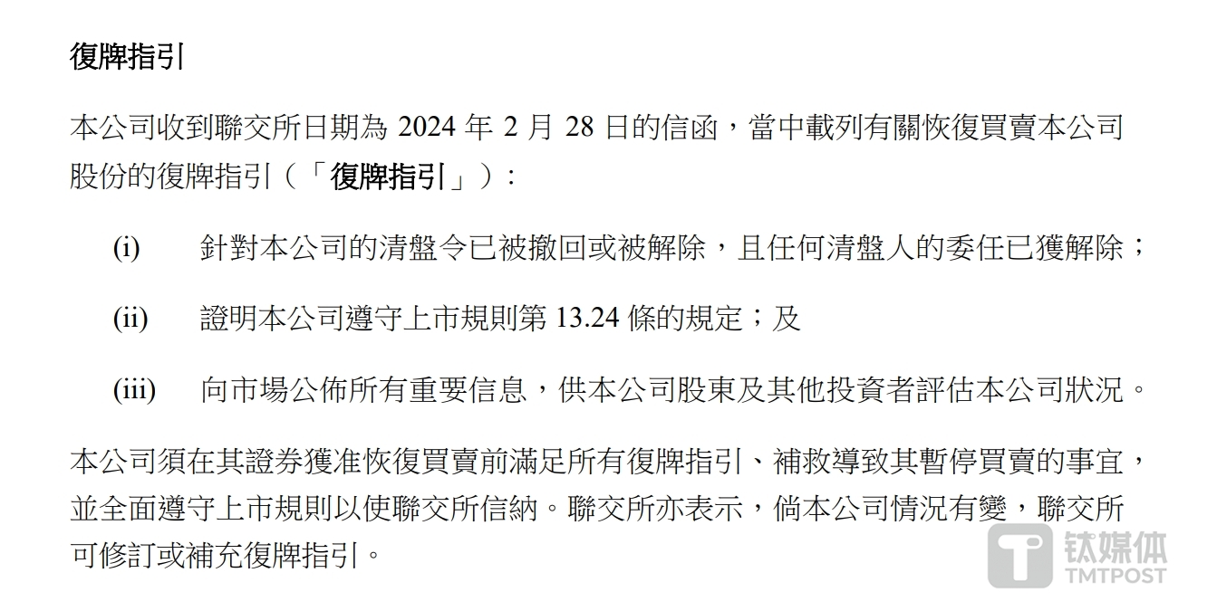 该指引明确,公司须满足三项条件才能恢复交易,具体包括:① 针对公司的清盘令已被撤回或被解除,且任何清盘人的委任已获解除;② 证明公司遵守上市规则第13.24条的规定;③ 向市场公布所有重要信息,供公司股东及其他投资者评估公司状况。
