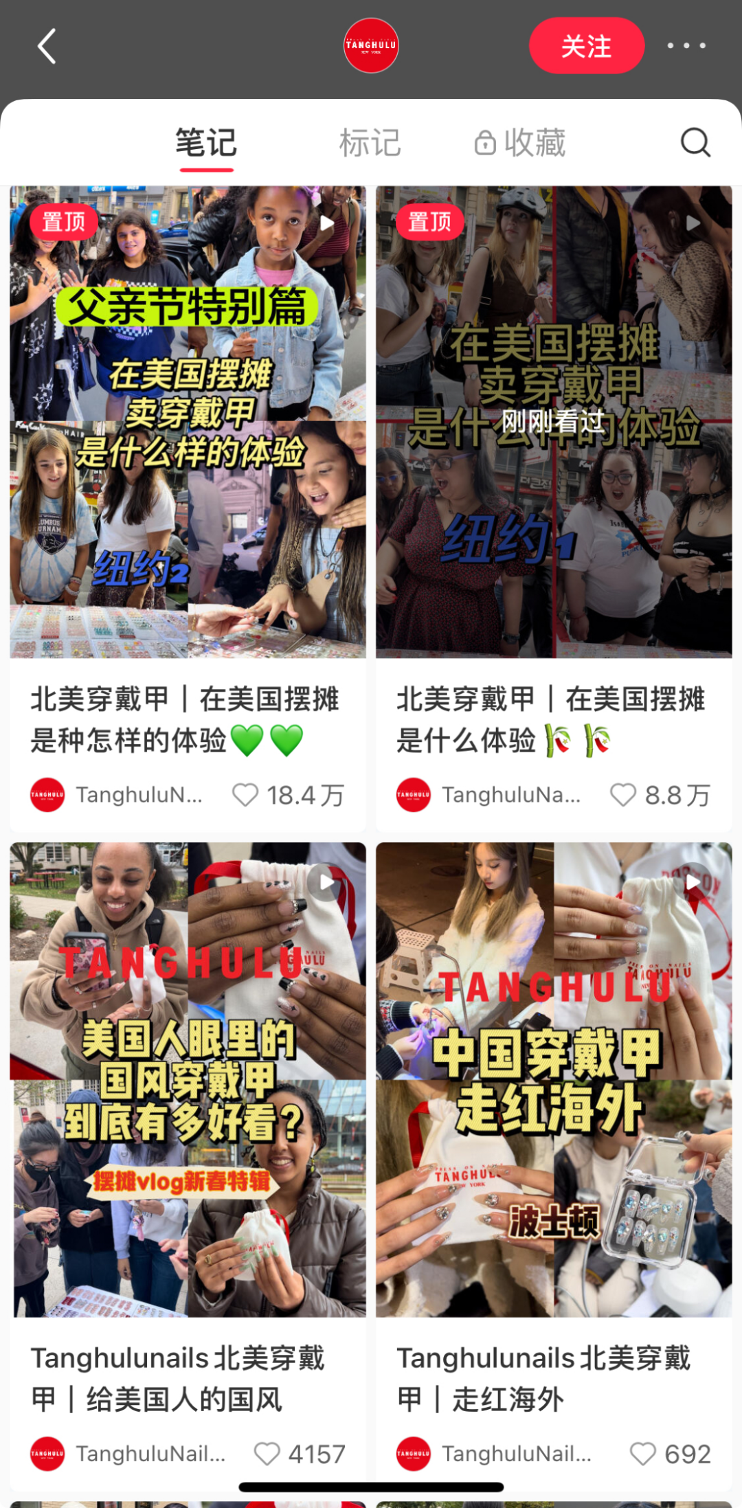 在小红书搜索“北美穿戴甲”,能显示3万多条笔记。一条在美国摆摊卖穿戴甲的视频,有8.8万点赞,摊主靠多样的款式和包贴服务年入百万。