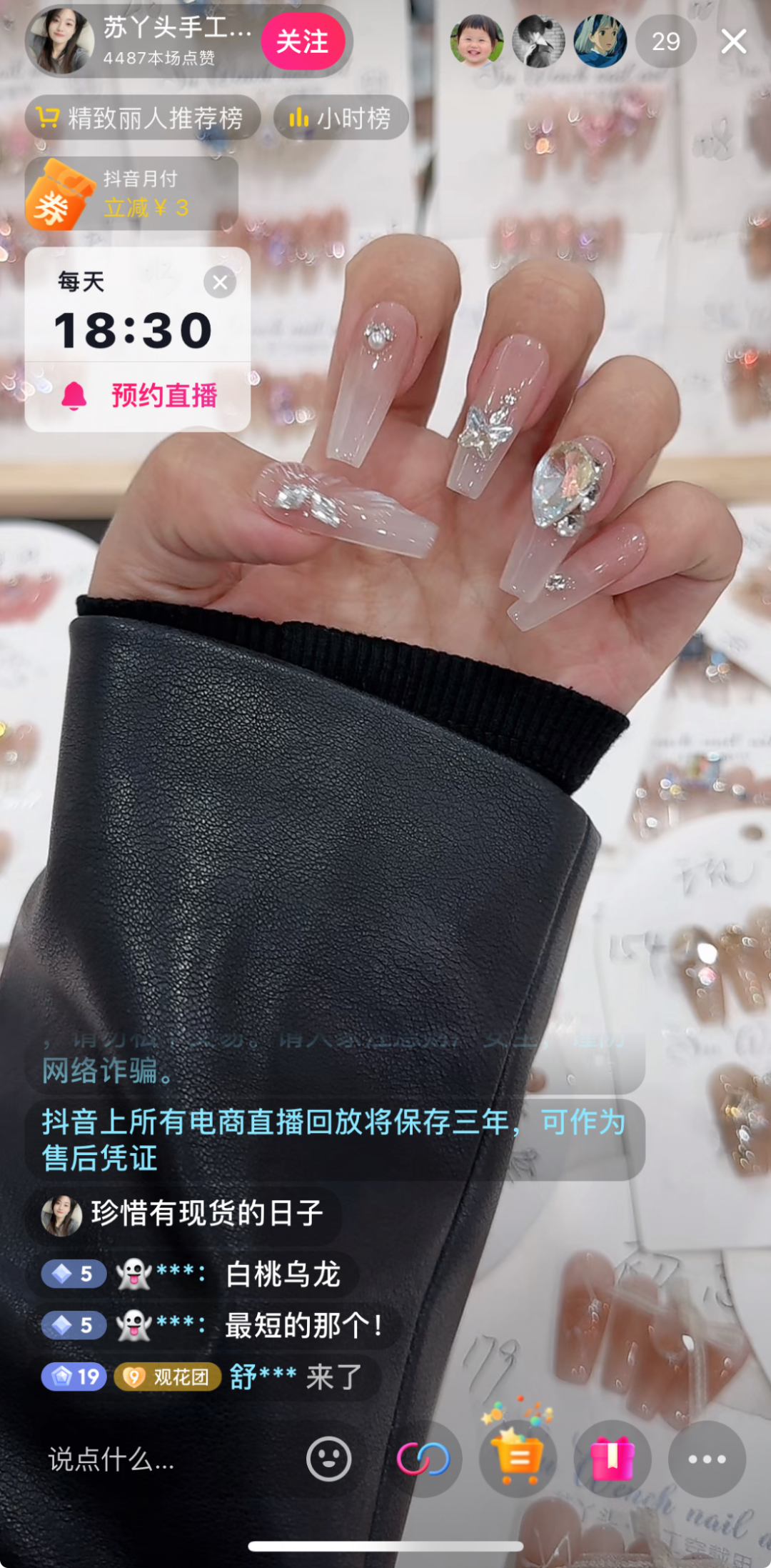 她们的直播从去年九月份才开始正式开始,通过不停分析数据调整款式,目前已经将目标人群锁定在了18-30岁左右的年轻女性。在她们看来,穿戴甲直播间,并不需要露脸,也不需要多么精致的手作为“第二张脸”,只要符合大众审美,越接近普通人的手,反而越能带货。