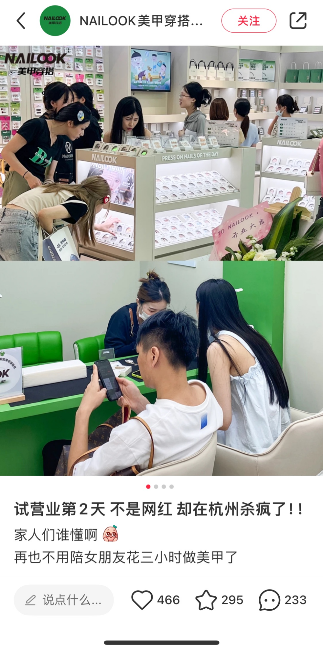 在2023年8月,杭州嘉里中心负一层开出了首家穿戴甲门店“NAILOOK”,一开业就吸引了大批年轻女孩选购,根据品牌公布的数据,开业当日门店业绩就突破一万元。随后,这个以绿色门头为标志的穿戴甲门店,以每日一店的速度,在国内各大城市的商圈落脚。