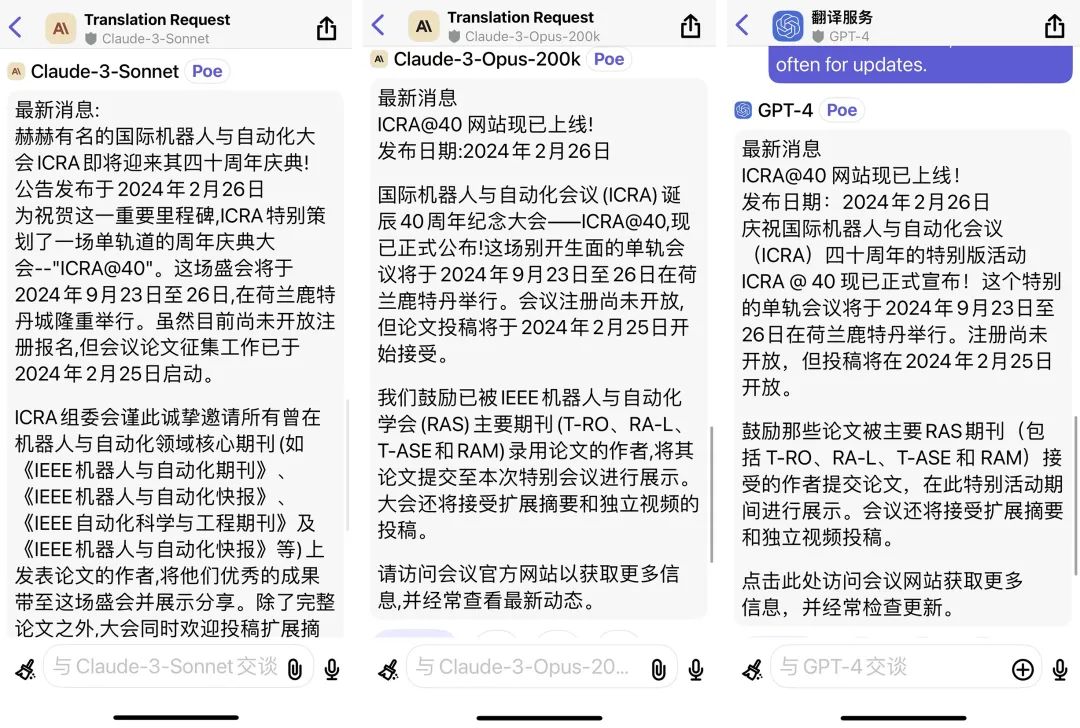 PS:适道在Poe上使用同样的提示语,让Opus、Sonnet、GPT-4 Turbo随机做了一段简单的新闻翻译。结果,Sonnet的表现居然最好,甚至翻译出了缩写!Opus水平巨中,而GPT-4直接忽略了主语。。。