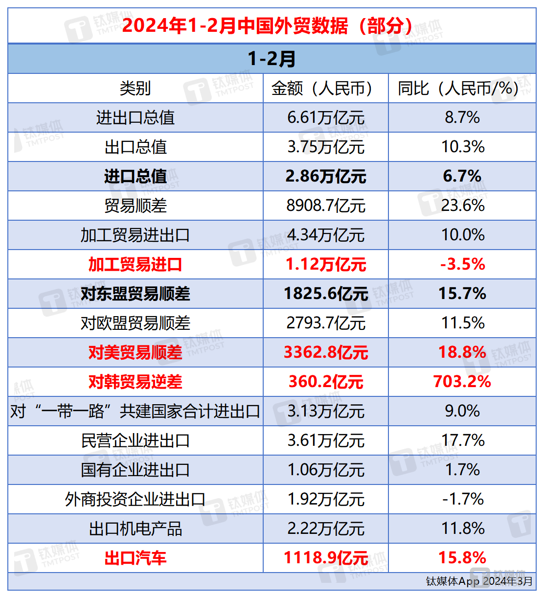3月7日消息,海关总署发布今年前2个月外贸数据。据海关统计,前2个月进出口总值6.61万亿元人民币,同比增长8.7%;加工贸易进口4.34万亿元,同比增长10%。前2个月对东盟贸易顺差1825.6亿元,扩大15.7%;对欧盟贸易顺差2793.7亿元,扩大11.5%;对美贸易顺差3362.8亿元,扩大18.8%;对韩贸易逆差360.2亿元,扩大703.2%。前2个月,民营企业进出口3.61万亿元,同比增长17.7%;国有企业进出口1.06万亿元,增长1.7%;出口汽车1118.9亿元,同比增长15.8%。