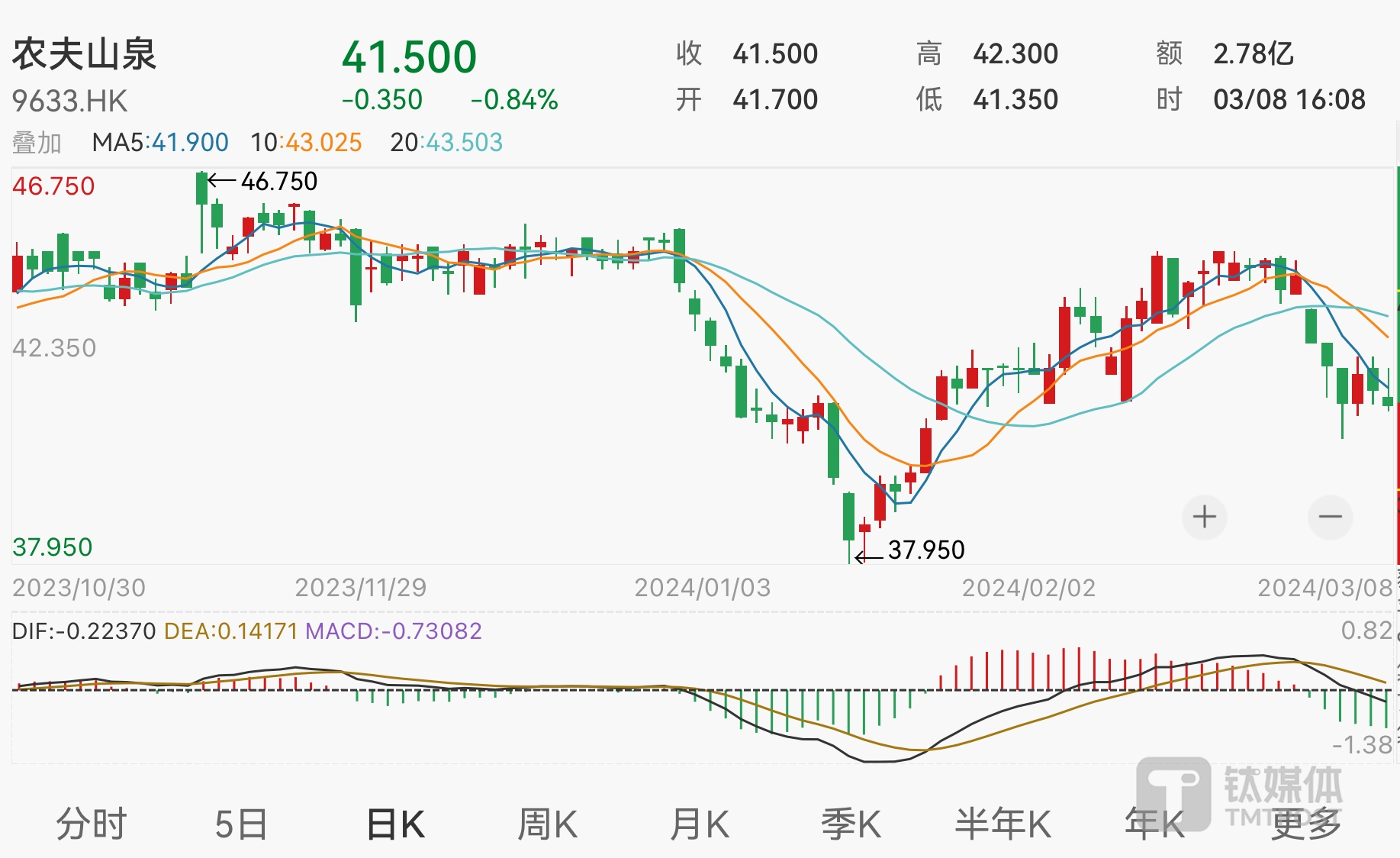 虽然公司股价曾在3月6日出现短暂回升,但自3月7日起再度下跌,截至目前公司股价已跌至41港元附近。