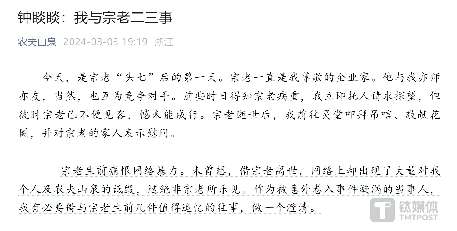 面对突如其来的危机,农夫山泉创始人钟睒睒于3月3日在公司官方微信公众号上发布了一篇名为《钟睒睒:我与宗老二三事》的文章,旨在表达对宗庆后的崇敬之情,并在文中首次公开自己第一桶金的来源是布匹生意,以及助力宗庆后开发八宝粥产品,受宗庆后提议在广西、海南成立娃哈哈办事处销售娃哈哈儿童营养口服液。