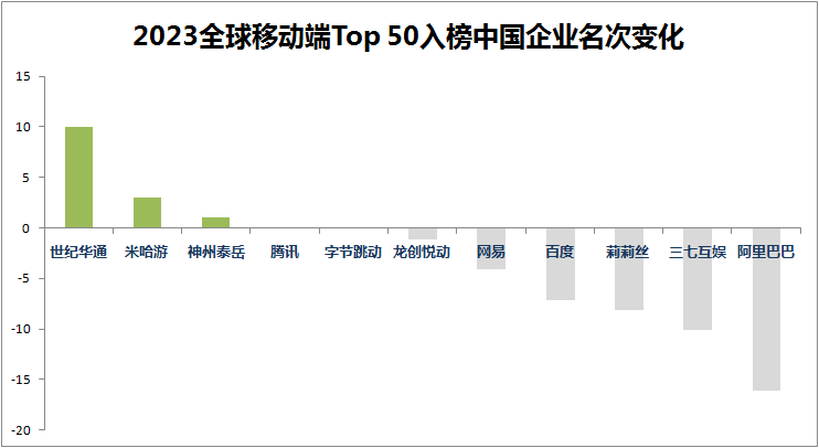2022 和 2023 年同时进入 Top 50 榜单的中国企业里,只有世纪华通(上升 10 位)、米哈游(上升 3 位)和神州泰岳(上升 1 位)三家企业排名上涨,其中世纪华通的上涨幅度最大(世纪华通旗下手游厂商点点互动,此前 data.ai 都以点点互动的名义统计流水成绩)。
