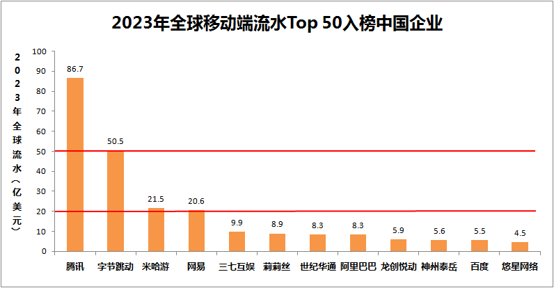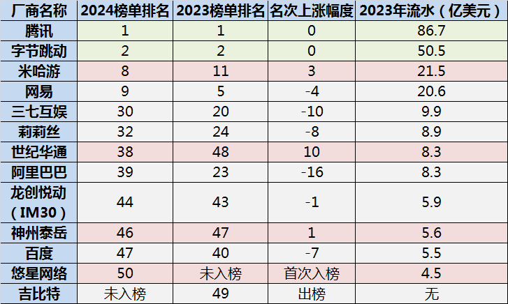 对比 2022 和 2023 年榜单,2023 年共有 12 家中国企业跻身全球流水 Top 50,和 2022 年相同。其中的变化在于,一家公司出榜,一家公司入榜。2022 年位居第 49 位的吉比特出榜,而悠星网络在 2023 年首次入榜,位居第 50 位。