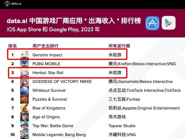 腾讯、字节继续瓜分冠亚军位置,米哈游首进Top 10、是海外游戏收入Top1