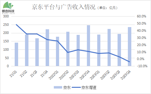平台及广告服务收入是反映商家活跃情况,平台商业生态繁荣度的核心指标,如今也是贯彻刘强东“低价”的核心手段。过去一年,该收入的增速连连走低,让人颇为意外。