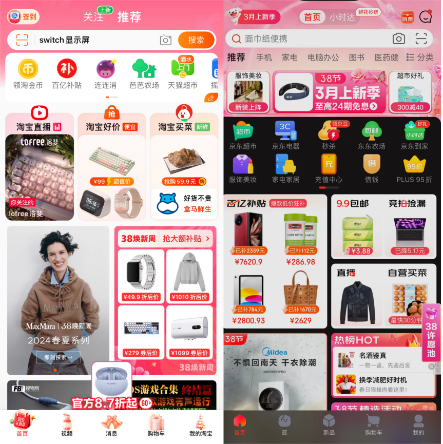 以应用首页为例,京东在下方的入口分别:首页(功能)、为逛(推荐)、新品(推荐)、购物车(功能)、我的(功能)五个模块,非常接近于内容化变革前的淘天。手淘APP的下方入口中,逛变为了视频。淘天借助小游戏、社交、补贴、站外引流等多种方式,逐渐建立起了用户刷视频的心智,从而挖掘潜在购物需求。