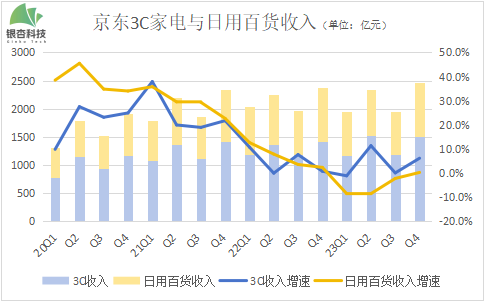京东商品收入分为3C家电与日用百货两个板块。手机厂商第四季度新机迭代等行业助推,京东3C家电收入1504亿元,同比增长6.1%。相较而言,日用百货板块的增长则不尽如人意,同期收入961亿元,与去年同期持平,值得一提的是,去年前三个季度都程下滑态势。