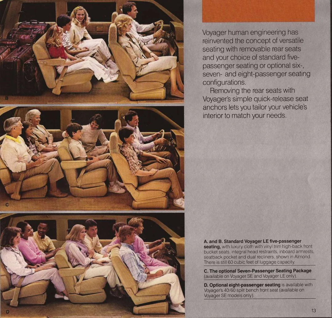 MPV车型的发展已经有很多年的历史,家用属性也并非由李想原创。1983年,克莱斯勒就推出了普利茅斯航海家(Plymouth Voyager),该车型拥有默认的2-2-3座椅布局,完全主攻家庭市场。就连该车当时的广告,都印刷着一家人驾车出行的样子。