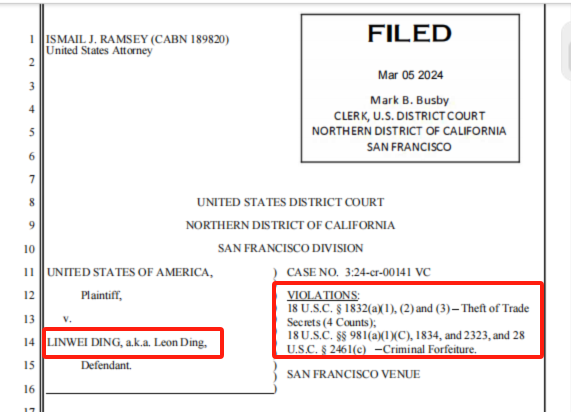 起诉书中称,2022年5月21日起,丁林葳开始将谷歌机密信息上传到个人谷歌云账户,并持续进行定期上传至2023年5月2日。期间,丁林葳上传的特殊文件有超过500份,包括谷歌TPU V4与TPU V6的芯片架构和软件设计规范、部署在数据中心的GPU芯片的硬件软件系统管理和性能规范、管理机器学习工作负载的谷歌CMS软件设计规格等。