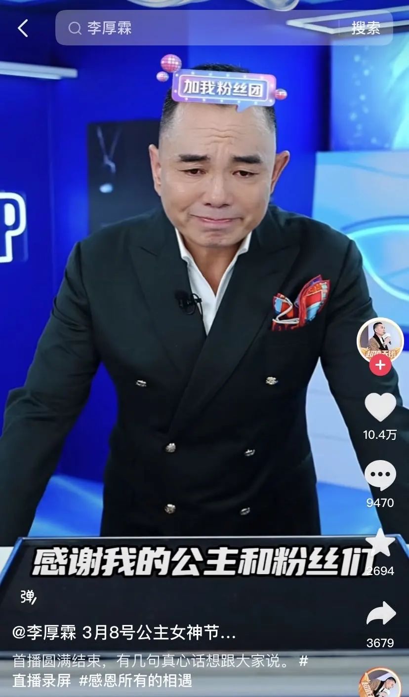 一次是首次直播带货超千万,在直播间一把鼻涕一把泪地感谢直播间的公主和王子们“是你们改变了我的余生,让我重新能够再活一次”。李厚霖还特地将自己哭泣的视频置顶在抖音主页,点赞数已过10万。