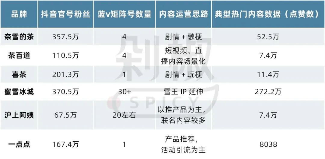 如今各品牌依然在短视频内容上不断尝试出新,剁椒观察基本上所有品牌都在抖音上日常发布视频内容,我们重点列出了奈雪的茶、茶百道、喜茶、蜜雪冰城四个品牌的抖音官方号作为论证,他们是这个行业中的头部,内容营销思路也相对较为明晰,便于提炼。