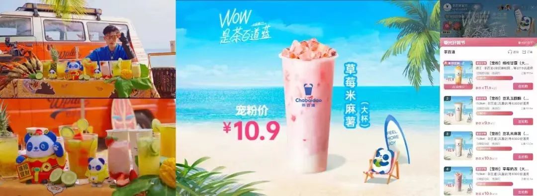 去年,茶百道在三亚做了一场直播,把直播间打造成三亚海景风格,海上摩托艇、彩虹拖伞、海岸线航拍这些元素都进入到品牌直播间里。据报道,这次单日直播GMV破亿。