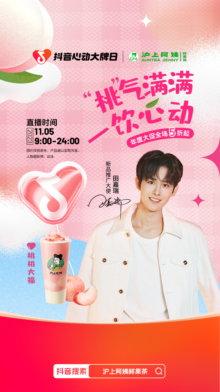 第一,推新品,在双十一期间沪上阿姨推出桃桃大福新款饮品。第二,联动平台参与话题活动。在社交型的平台做营销活动,参与话题是必不可少的环节,无论是微博还是抖音,这是一个很好的聚合流量窗口。沪上阿姨拉来品牌推广大使田嘉瑞一起在抖音上做活动,激发用户做二创。根据抖音生活服务提供的数据,活动周期内短视频投稿量达4.3万+,短视频曝光2.6亿,沪上阿姨官方话题#桃桃大福奶甜上新 曝光2854万次。