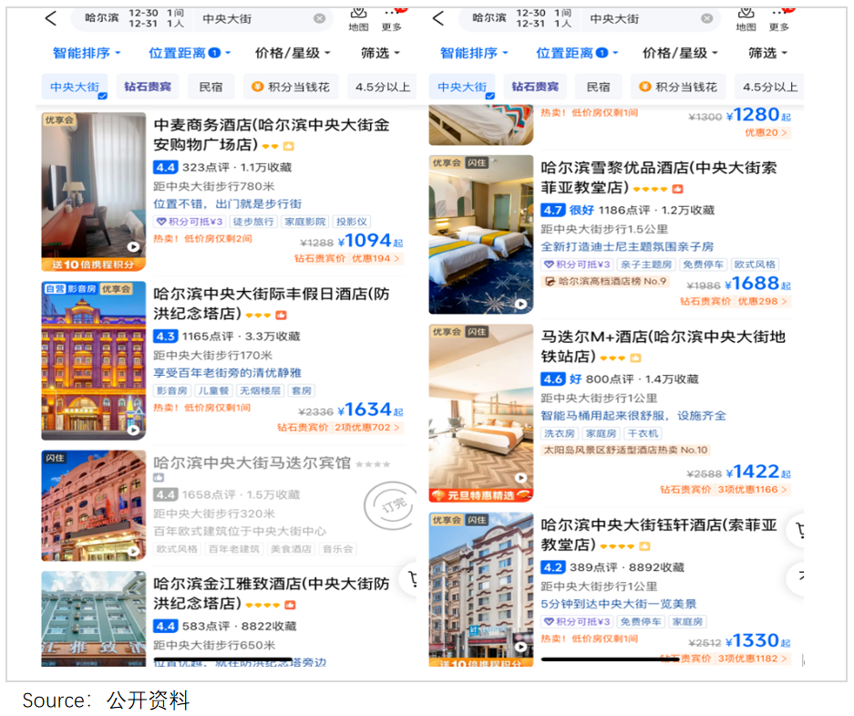 此时,将房间资源放在OTA渠道上,可以涨价卖。如下图,供不应求下,中央大街附近的普通酒店价格在12月30日卖到了1000+/晚,是平时的两三倍。